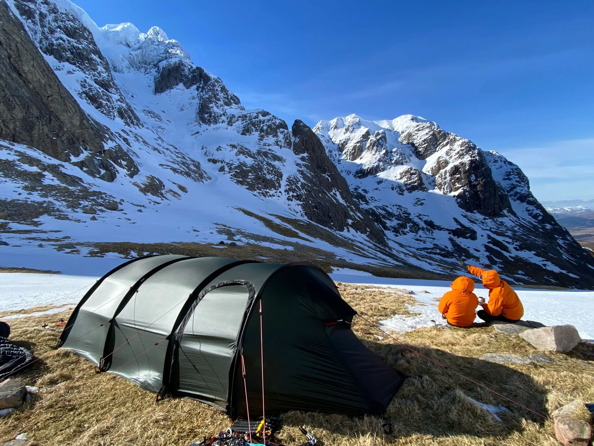 Two people in orange jackets sitting on rocks near a tent in a snowy mountain landscape with steep snow-covered peaks and a clear blue sky.